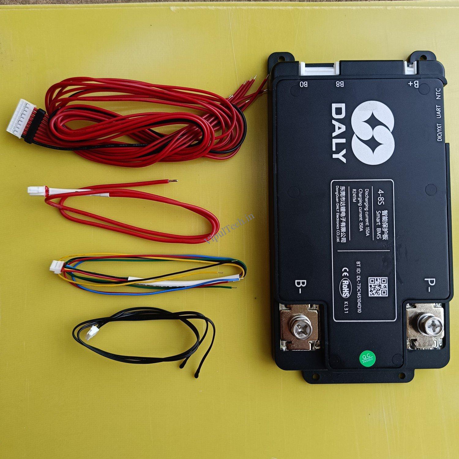 The 4-8S 150A Daly Smart BMS (4S-8S 150A Smart BMS with Passive balancing is a high-performance management system for LiFePO4 or Li-ion batteries (12V-24V). Featuring Bluetooth, it enables real-time monitoring via a smartphone app to maximize battery longevity, suitable for solar storage and EVs.